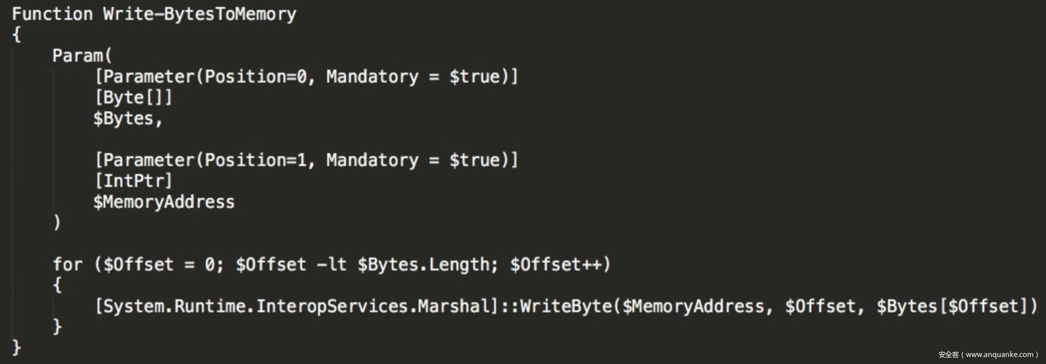 而在Powershell脚本中JSBot通过一系列函数在内存空间中将PE写入,同样实现了无文件落盘的操作,如图写内存函数