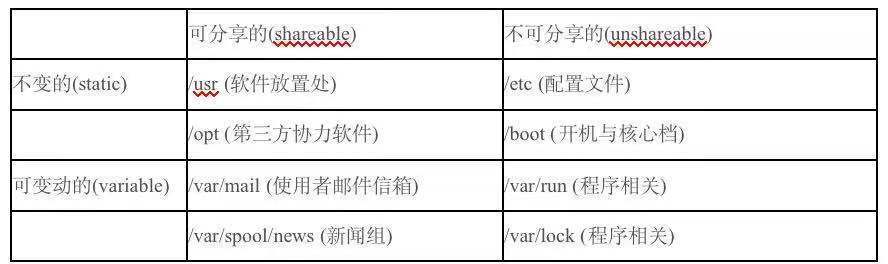 FHS依据文件系统使用的频繁与否与是否允许使用者随意更动, 而将目录定义成为四种交互作用的形态,用表格来说有点像底下这样: