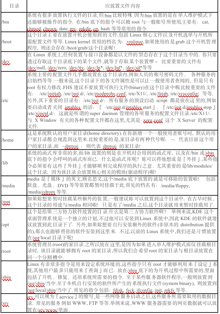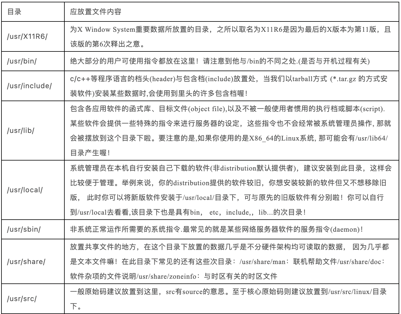 事实上,FHS针对目录树架构仅定义出三层目录底下应该放置什么数据而已,分别是底下这三个目录的定义: