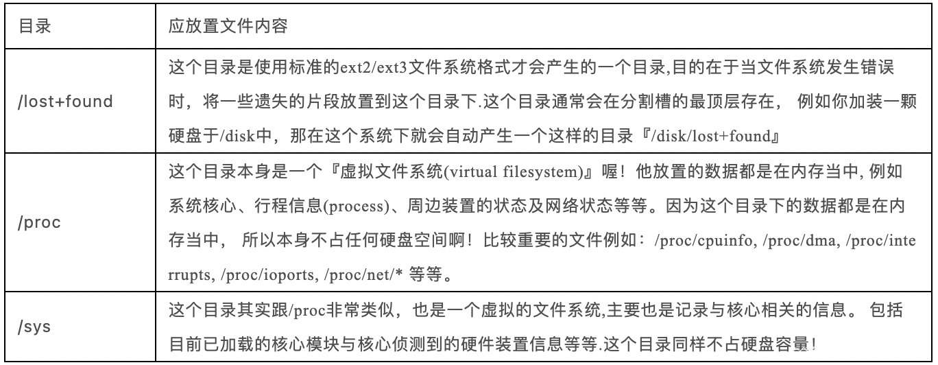 除上FHS中定义的目录说明外,底下是几个在Linux当中非常重要的目录: