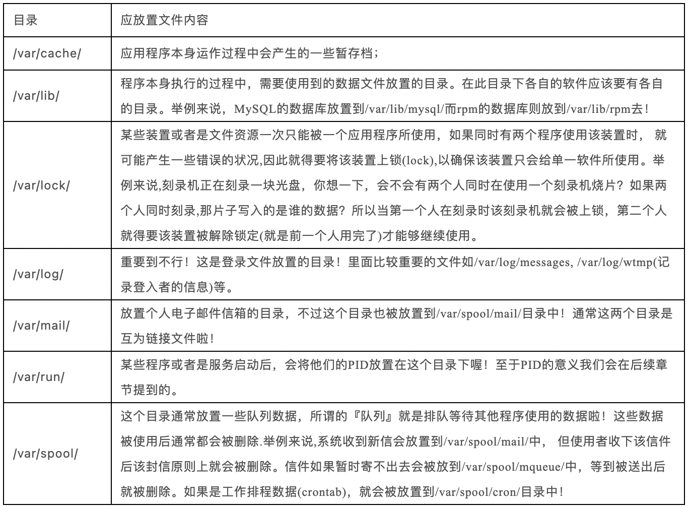 /var目录主要针对常态性变动的文件,包括缓存(cache)、登录档(log file)以及某些软件运作所产生的文件,包括程序文件(lock file, run file),或者例如MySQL数据库的文件等等。所以/var在系统运作后才会渐渐占用硬盘容量的目录