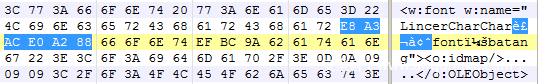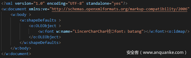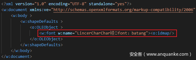 观测到<w:font 标签内有异常字符,且标签未正常闭合,预测漏洞触发于该处。