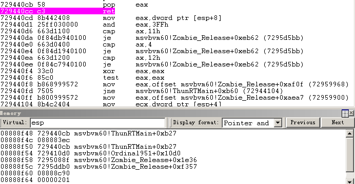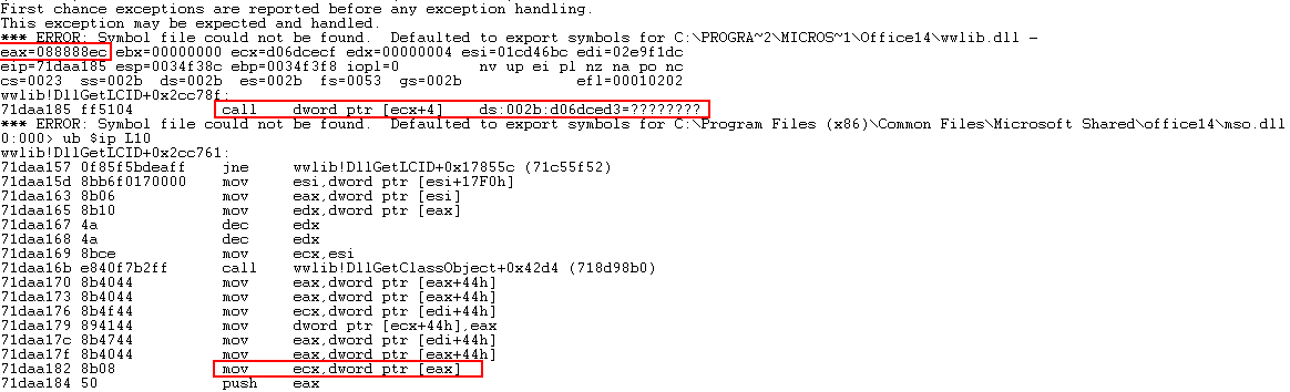 > bp wwlib+4da184> gBreakpoint 0 hiteax=088888ec ebx=00000000 ecx=088883ec edx=00000004 esi=004b44b4 edi=0340cddceip=6e2da184 esp=002f5f14 ebp=002f5f7c iopl=0 nv up ei pl nz na po nccs=0023 ss=002b ds=002b es=002b fs=0053 gs=002b efl=00000202wwlib!DllGetLCID+0x2cc78e:6e2da184 50 push eax0:000> u $ipwwlib!DllGetLCID+0x2cc78e:6e2da184 50 push eax6e2da185 ff5104 call dword ptr [ecx+4]6e2da188 e9fabdeaff jmp wwlib!DllGetLCID+0x178591 (6e185f87)6e2da18d 83f802 cmp eax,26e2da190 750f jne wwlib!DllGetLCID+0x2cc7ab (6e2da1a1)6e2da192 83c624 add esi,24h6e2da195 56 push esi6e2da196 52 push edx> dd ecx+4088883f0 72980e2b 72980e2b 72980e2b 72980e2b08888400 72980e2b 72980e2b 72980e2b 72980e2b08888410 72980e2b 72980e2b 72980e2b 72980e2b08888420 72980e2b 72980e2b 72980e2b 72980e2b08888430 72980e2b 72980e2b 72980e2b 72980e2b08888440 72980e2b 72980e2b 72980e2b 72980e2b08888450 72980e2b 72980e2b 72980e2b 72980e2b08888460 72980e2b 72980e2b 72980e2b 72980e2b
