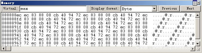 发现和在文档3中的字符串一致,接着查看eax+44,对应的正是异常触发时eax的值088888ec。