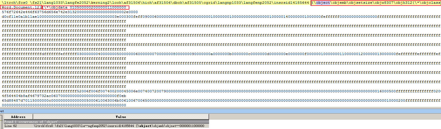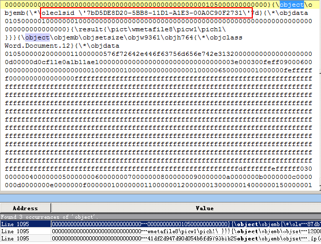 新建一个rtf文件,将替换好的docx文件添加到rtf文件中,保存后使用010Editor打开,搜索object,将{\object和{*\objdata的全部内容复制: