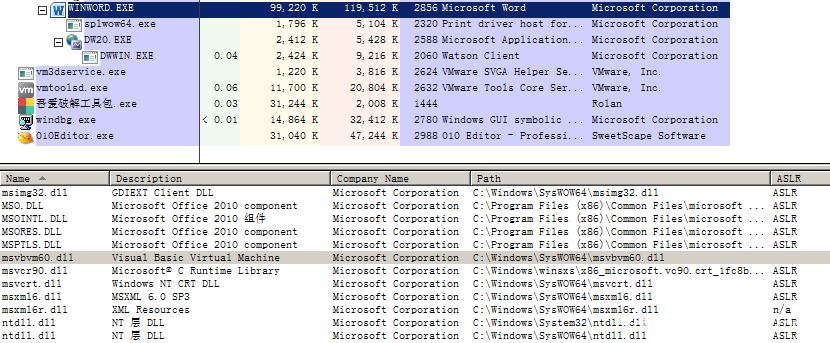 通过ProcessExplorer发现word打开rtf文档后确实加载了msvbvm60.dll,且该dll无ASLR,说明该ole对象的作用是绕过ASLR。