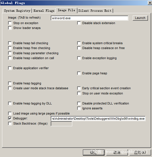 先启动word然后使用windbg附加会导致堆喷无法成功,继而无法分析漏洞利用部分。因此使用gflags.exe让调试器直接加载winword.exe: