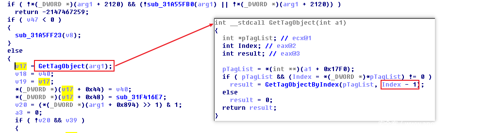 继续向上追溯,发现函数GetTagObject也调用了GetTagObjectByIndex,通过分析发现该函数获取的是TagObject Array[Index-1]的地址: