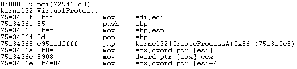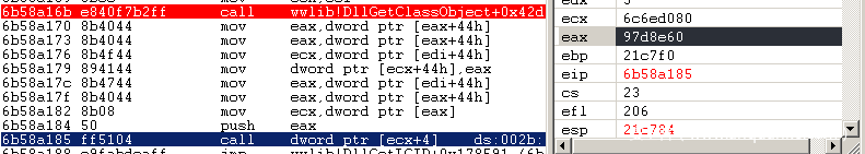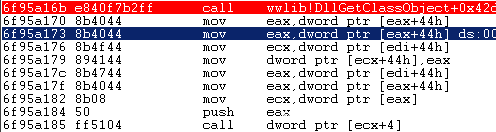 > bp wwlib+4da16b> gBreakpoint 1 hiteax=070f1800 ebx=00000000 ecx=0225466c edx=00000004 esi=0225466c edi=070f19dceip=6f95a16b esp=002cf428 ebp=002cf490 iopl=0 nv up ei pl nz na po nccs=0023 ss=002b ds=002b es=002b fs=0053 gs=002b efl=00000202wwlib!DllGetLCID+0x2cc775:6f95a16b e840f7b2ff call wwlib!DllGetClassObject+0x42d4 (6f4898b0)> ub $ip L8wwlib!DllGetLCID+0x2cc75d:6f95a153 83780401 cmp dword ptr [eax+4],16f95a157 0f85f5bdeaff jne wwlib!DllGetLCID+0x17855c (6f805f52)6f95a15d 8bb6f0170000 mov esi,dword ptr [esi+17F0h]6f95a163 8b06 mov eax,dword ptr [esi]6f95a165 8b10 mov edx,dword ptr [eax]6f95a167 4a dec edx6f95a168 4a dec edx6f95a169 8bce mov ecx,esi