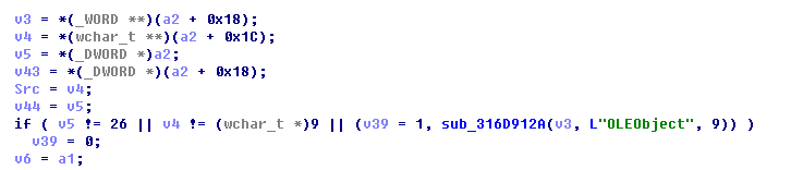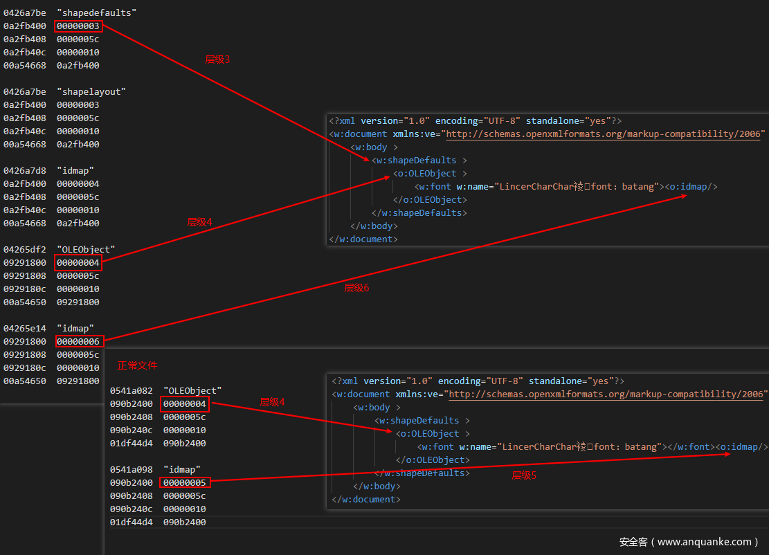 分析到这里,漏洞产生的原因也就出来了,由于word每解析一个标签,Current_Index的值就加一,当解析到闭合标签,Current_Index值会减1。由于构造了没有闭合的font标签,因此导致在解析idmap标签时比正常文件的Current_Index多一,导致原本应该获取OLEObject标签的TagObject变成获取了font的TagObject,因此造成了标签类型混淆导致漏洞的发生。