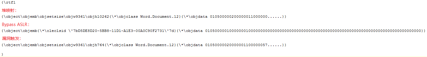 再新建一个rtf文件,按照堆喷射、Bypass ASLR和漏洞触发的顺序添加三个对象。堆喷射的内容就是上方复制好的内容,其他两个可以直接在原EXP中复制过来即可,最终EXP的结构如下所示: