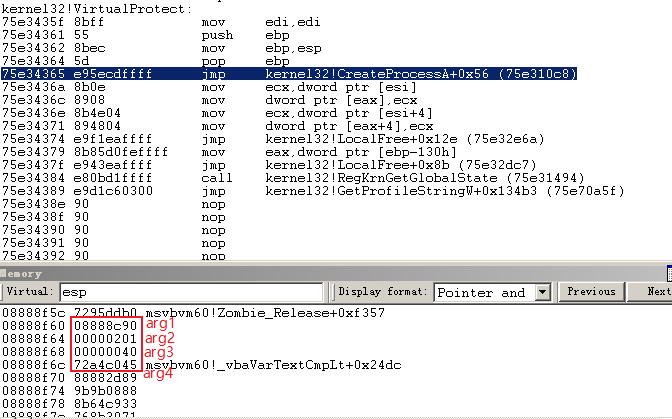 当执行到最后一次滑板指令时,会将0x729410d0放入eax中,而该值是msvbvm60.dll的IAT表中的数据,查看后存储的是VirtualProtect的地址: