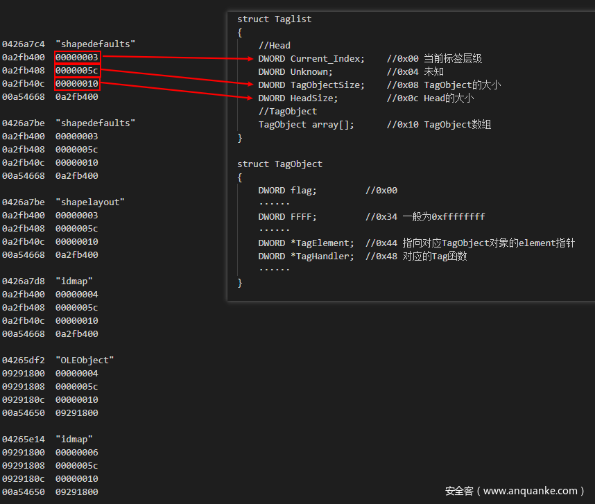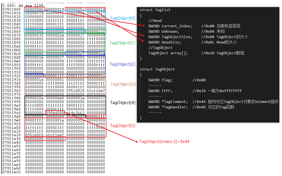 打印出的结构就是Taglist结构体,具体结构参考goabout2的office CVE-2017-11826杂谈一文。