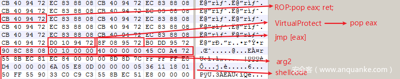 紧接着通过ret跳转到ROP指令jmp [eax]执行VirtualProtect,而此时栈中为构造好的VirtualProtect的参数: