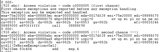 然而VirtualProtect的修改的内存范围只有0x08888c90 - 0x08888e91,而shellcode却位于0x08888f70,因此会触发c0000005访问异常,shellcode执行失败: