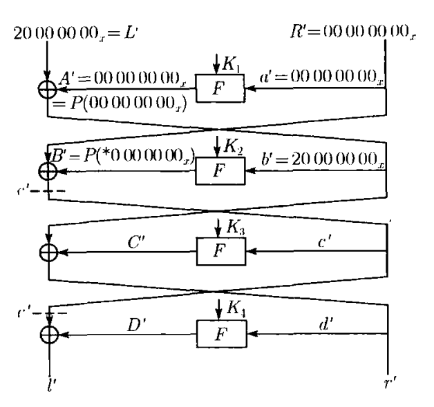 可以看到,几乎每一组都被”污染了“,只剩第5组还是 0 那么 C’ = ****0***,然后这里还有一个 P 盒置换,那么第三轮走完,左边等于C’ ⊕ b’ = 20000000 ⊕ P(****0***),右边等于c’ = ****0***(注,这里 * 为不确定的意思,进入S 盒前的 * 大概率不等于出 S 盒后的 *)