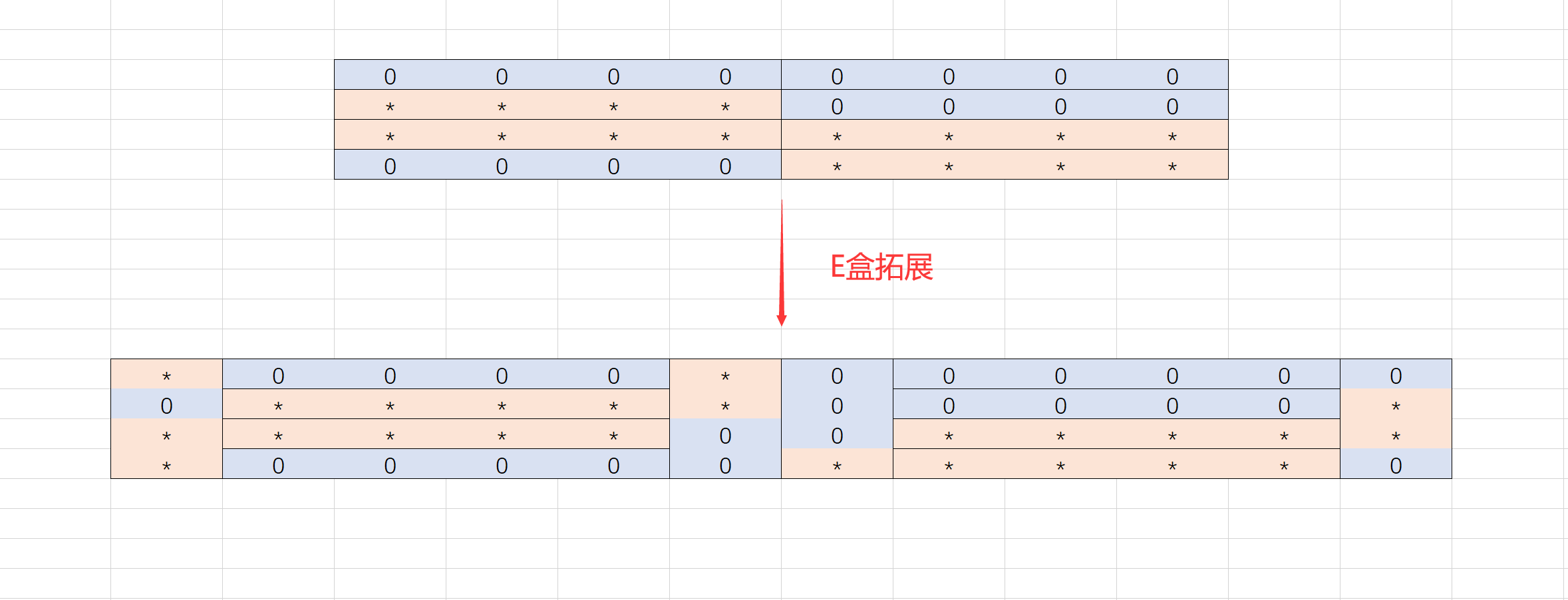 这里我们不确定的前四个bit被扩散到了第3,5,6,8组,也就是说现在我们的c’ = 00*0**0*,然后这里还要先E 盒拓展,看看 E 盒