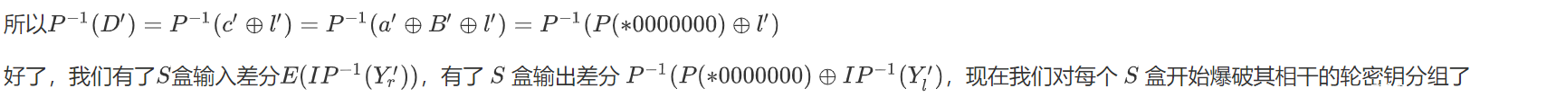 我们拿到输出明文差分Y’,对做半边求 IP 逆置换得到 l’ = c’ ⊕ D’,这个c’ = a’ ⊕ B’ = 00000000 ⊕ P(*00000000) ,