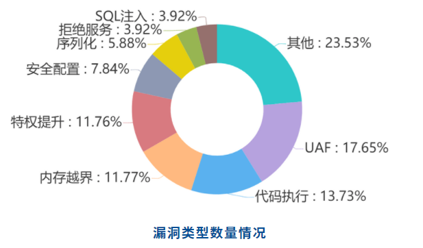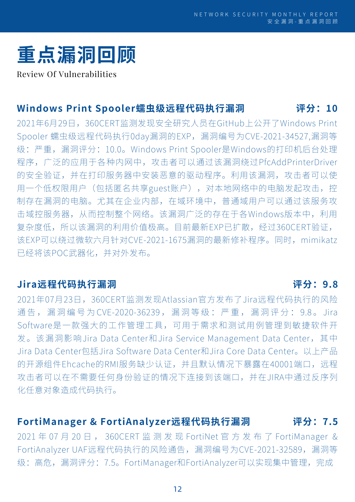 2021年7月,360CERT共收录51个漏洞,其中严重12个,高危29个,中危9个,低危1个。主要包含UAF漏洞、代码执行漏洞、内存越界漏洞、特权提升漏洞、安全配置漏洞、拒绝服务漏洞等。涉及的厂商主要是Windows、 Apple、Linux kernel、SonicWALL、Weblogic 、FortiManager、Jira、YAPI、Kaseya等。