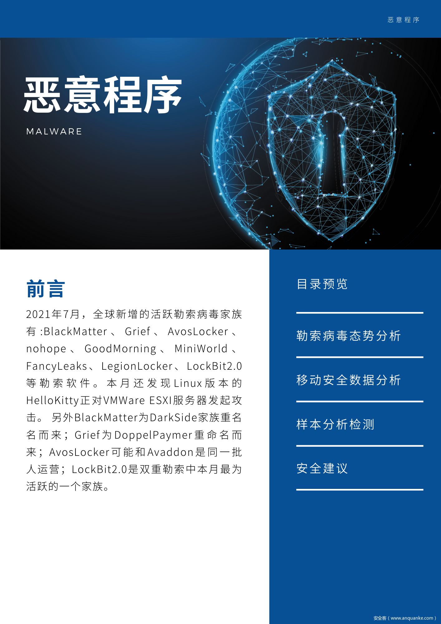 2021年7月,全球新增的活跃勒索病毒家族有:BlackMatter、Grief、AvosLocker、nohope、GoodMorning、MiniWorld、FancyLeaks、LegionLocker、LockBit2.0等勒索软件。本月还发现Linux版本的HelloKitty正对VMWare ESXI服务器发起攻击。 另外BlackMatter为DarkSide家族重名名而来;Grief为DoppelPaymer重命名而来,AvosLocker可能和Avaddon是同一批人运营;LockBit2.0是双重勒索中本月最为活跃的一个家族。