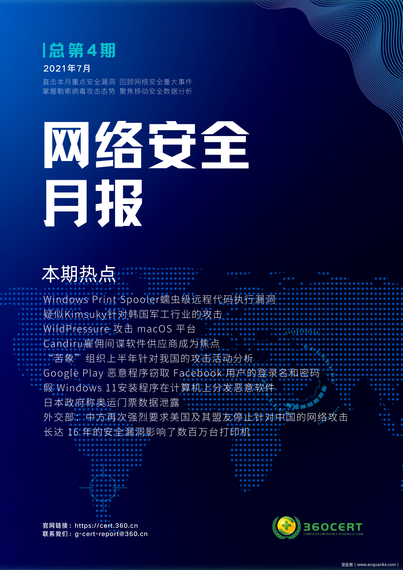 当前,随着数字化浪潮的不断加快,网络空间博弈上升到全新高度。潜在的漏洞风险持续存在,全球各类高级威胁层出不穷。洞悉国内外网络安全形势,了解网络安全重要漏洞是建设好自身安全能力的重要基石。在此背景下,360CERT推出《网络安全月报》,总结本月国内外安全漏洞、网络安全重大事件、恶意软件攻击态势、移动安全情况等。每个章节中都具备总结性文字、重点罗列、图表分析等展现形式,方便读者了解本月网络安全态势。