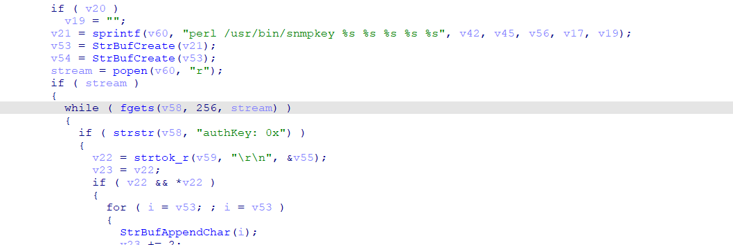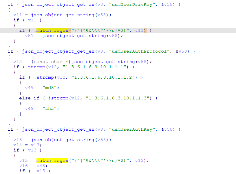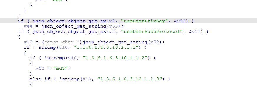 分析显示:程序最终会调用popen执行被sprintf格式化后的v60字符串,v60的最后一段子字符串来自变量v19,v19来自v44,v44来自json_object_get_string中的参数v52,v52正是usmUserPrivKey字段中的值。此函数在调用popen执行命令前未对usmUserPrivKey中的值进行过滤导致了命令注入。