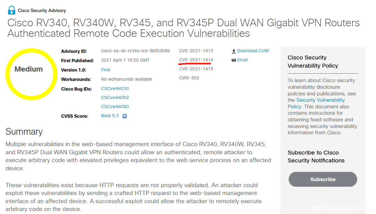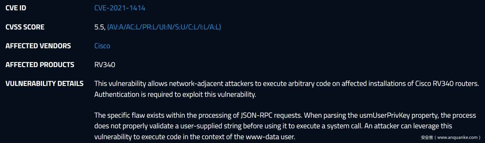 最近关注了Cisco的一个命令注入漏洞CVE-2021-1414,命令注入之后可导致远程代码执行: