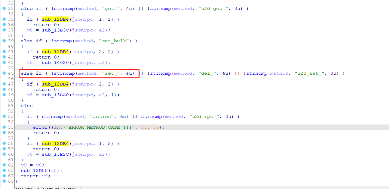 关键点位于else if ( !strncmp(method, “set_”, 4u),这里刚好与set_snmp指令的前4个字节匹配: