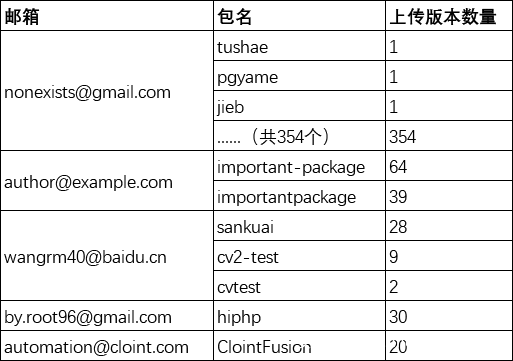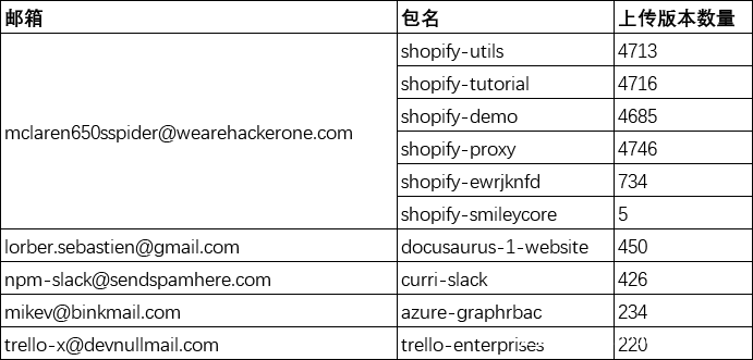 下面我们将近期监控到的上传了大量恶意包的攻击者罗列如下,针对这些攻击者的所有上传包后续会进行重点监控,以追踪攻击者攻击方式的变化。