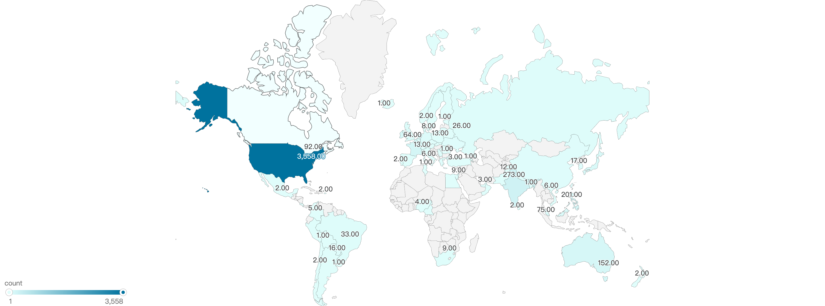 本期发现的恶意包下载共涉及80个国家和地区,分布情况如下: