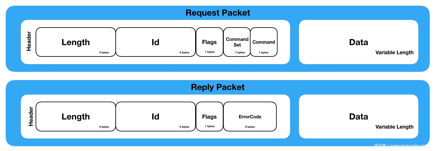 JDWP是基于TCP的二进制报文的网络协议,通过命令包(command packet)和回复包(reply packet)进行通信。其中Flags字段用于表明是命令包还是回复包,Command Set定义了Command类别。