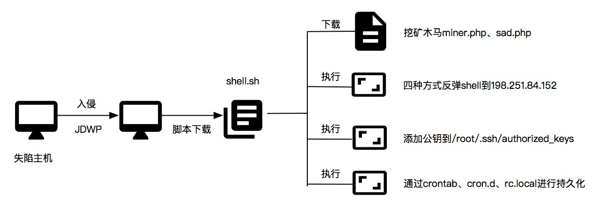 JDWPMiner通过JDWP RCE漏洞进行入侵和传播,利用shell.sh脚本下载挖矿木马并执行,通过crontab、cron.d、rc.local进行持久化,依据系统环境执行python、perl、nc、bash进行反弹shell到指定IP,从而完成整个入侵过程。