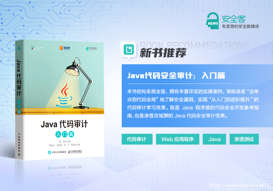 对于有意学习应用Java语言进行代码审计的人而言,新书《Java代码审计(入门篇)》是一本新手友好的的入门指南,可以帮助初涉这一领域的安全人员或研发人员补充实用预备知识。书中配备的详细案例讲解,也能方便初学者同步进行实际操作,扎实掌握知识技能。