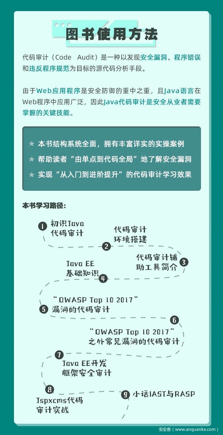新书获取方式1:在本文留言处评论你想要这本书的理由或者你学Java审计的坎坷经历/经验技巧 (不得少于15个字),我们将抽取6名用户,向每人赠书一本。