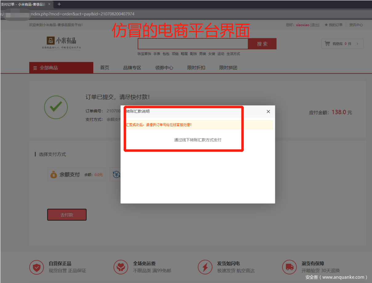 即用户在仿冒的购物商城购物,钱直接转给骗子。