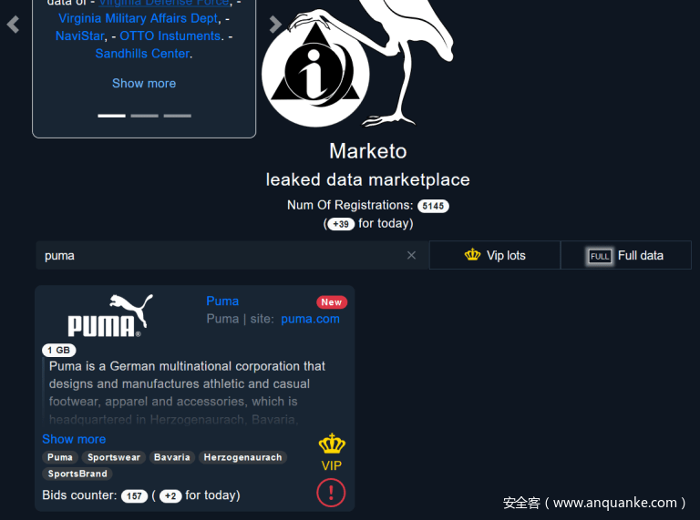 目前,流入Marketo暗网交易平台的Puma公司数据,就已被拍卖给了出价最高的人。而包括Puma公司数据外,目前已有至少157个注册用户出价购买了敏感数据。
