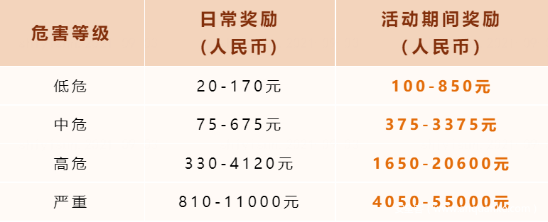 活动期间首个提交高危及以上漏洞额外奖励5000元现金,首个提交中危漏洞额外奖励500元现金!