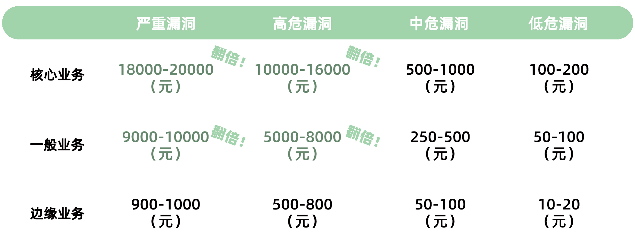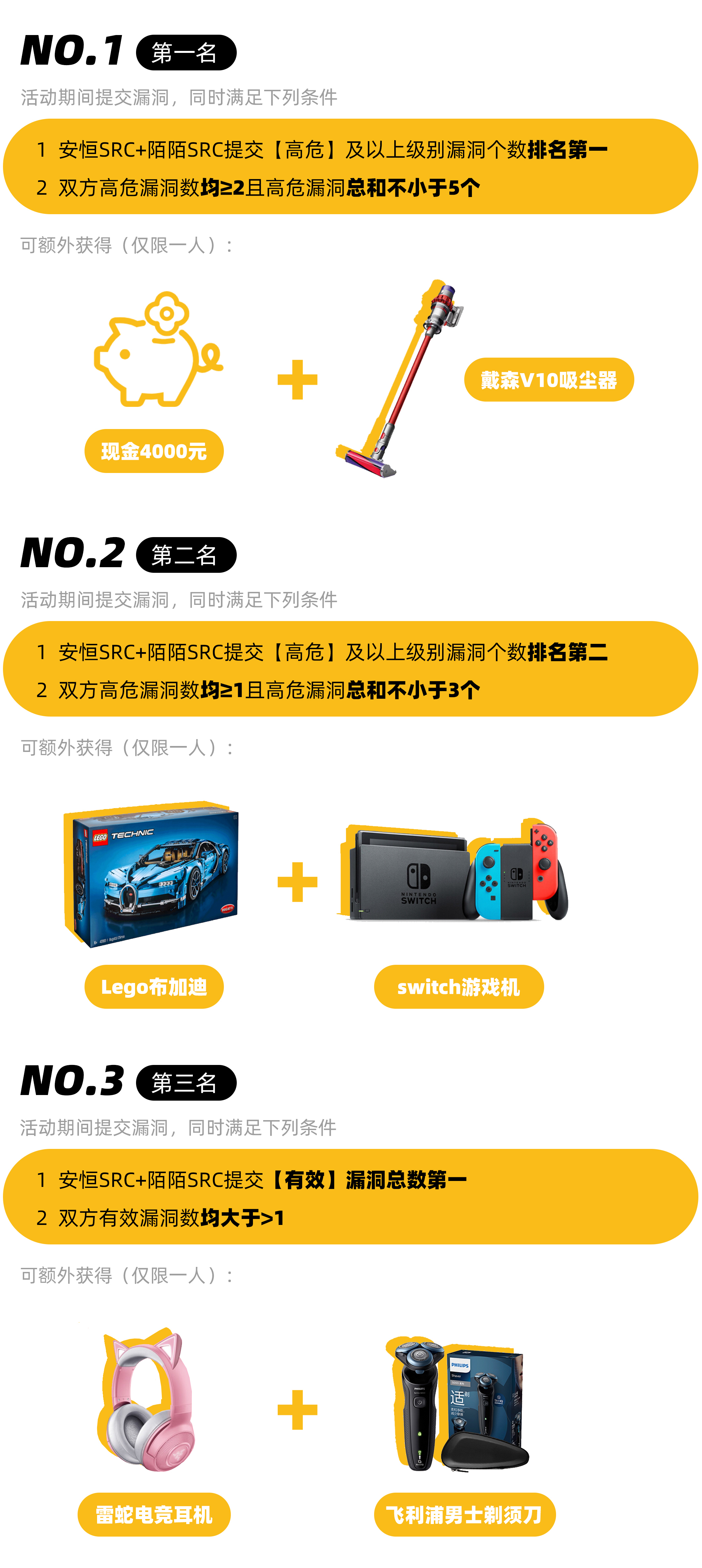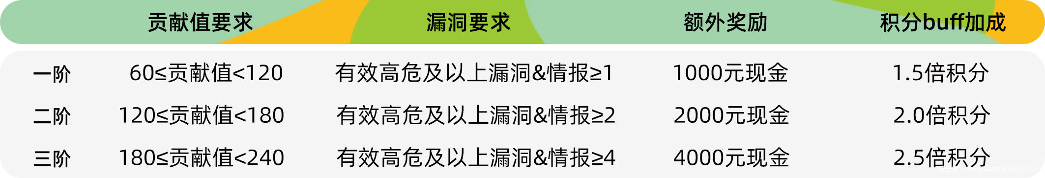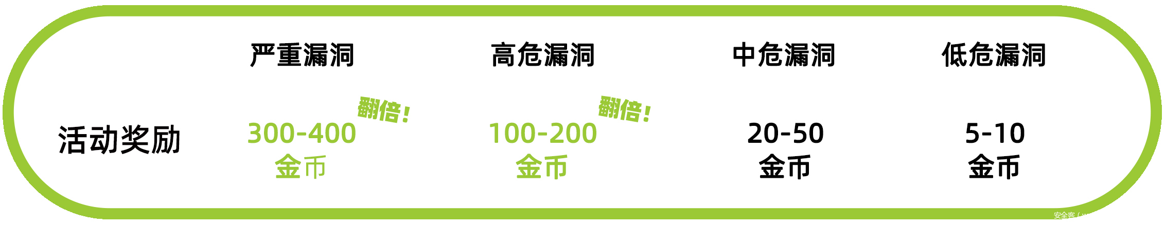 除此之外,我们还为漏洞个数排名靠前的白帽师傅准备了额外加成大礼,富贵险中求,多提多享受!