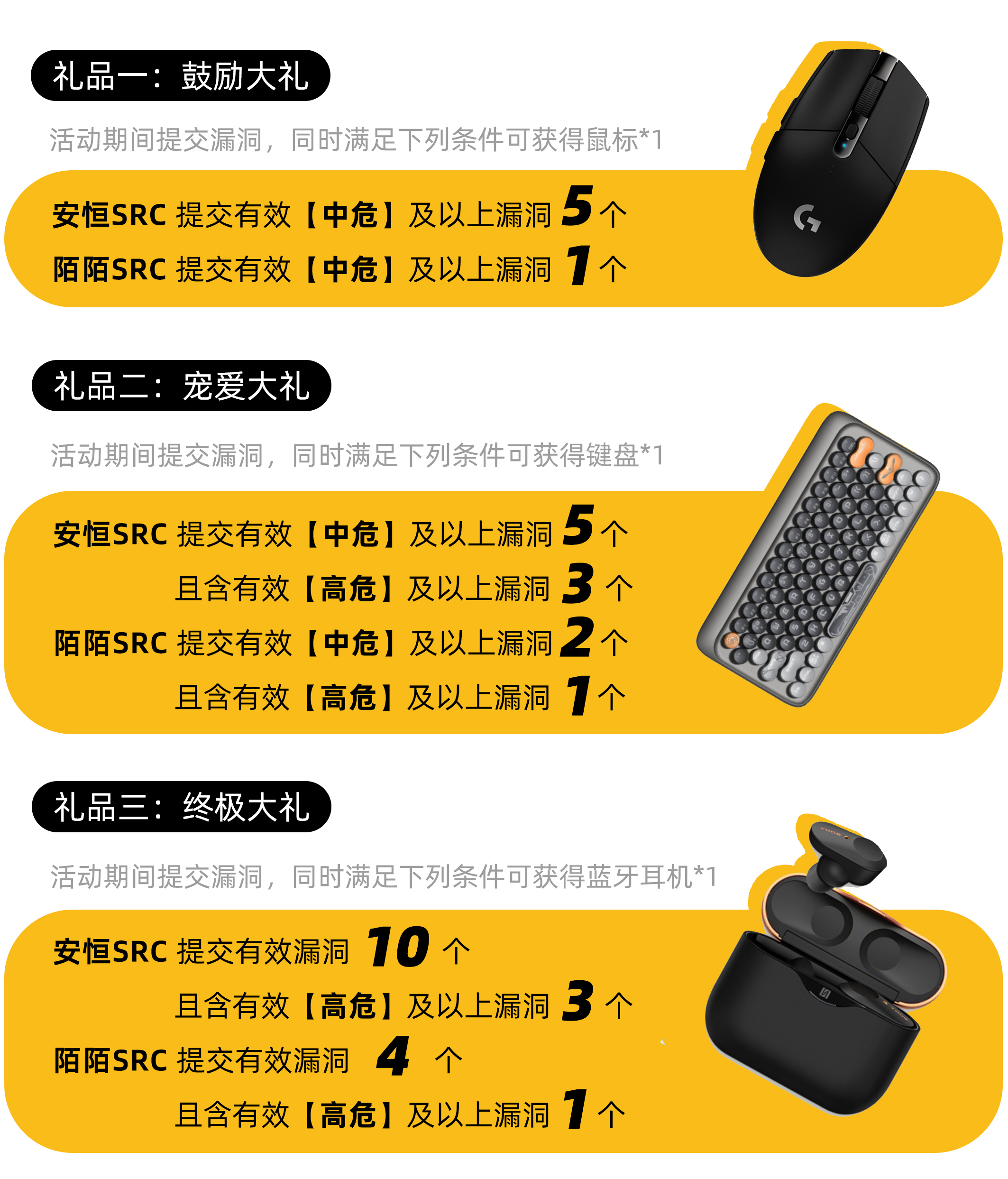 除了上述奖励加成外,活动期间同时满足以下条件的,还有额额额额额额外三重好礼送给各位白帽师傅!
