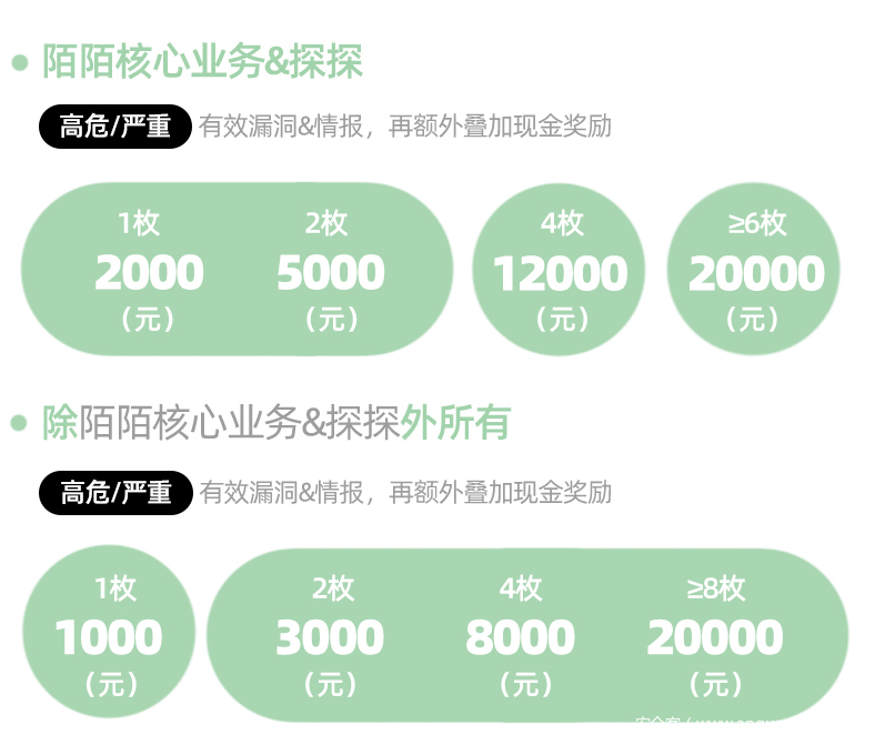 9.9-9.24期间,陌陌核心业务、一般业务的高危/严重有效漏洞&情报双倍积分奖励。