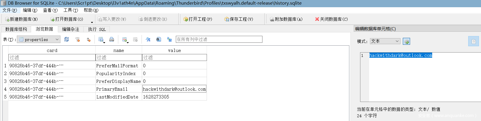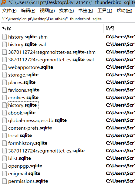 我们导出被调查者的用户文件夹,准备查看对应着电子邮件客户端的数据文件夹。使用everything,搜索sqlite,通过尝试即可知道是history.sqlite