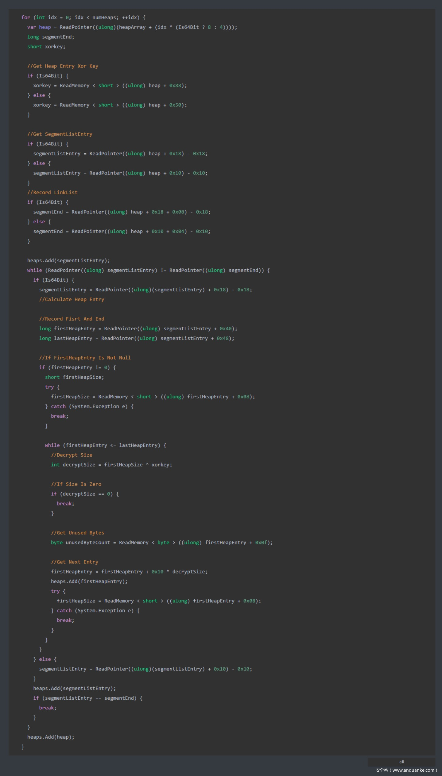 而经过阅读相关资料,发现并没有链表将所有堆块串联起来(无论堆块是何种状态),因此堆块的位置需要手动计算,这里存在一个小插曲,就是windows实际是加密了_HEAP_ENTRY这个结构的,加密方式是Xor,而Xor的密钥则在_HEAP结构的0x88(x86是0x50),因此在计算堆块大小时,需要手动解密Size