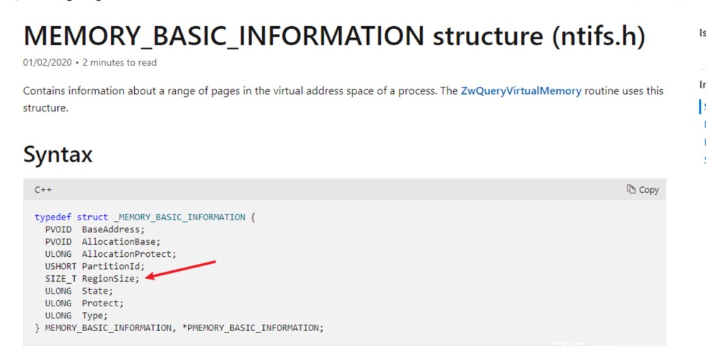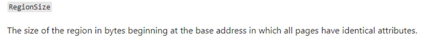 翻译过来的意思是,RegionSize的计算方式是,从起始地址开始,直到内存页的属性不一致为止,包含的byte数量,就是RegionSize