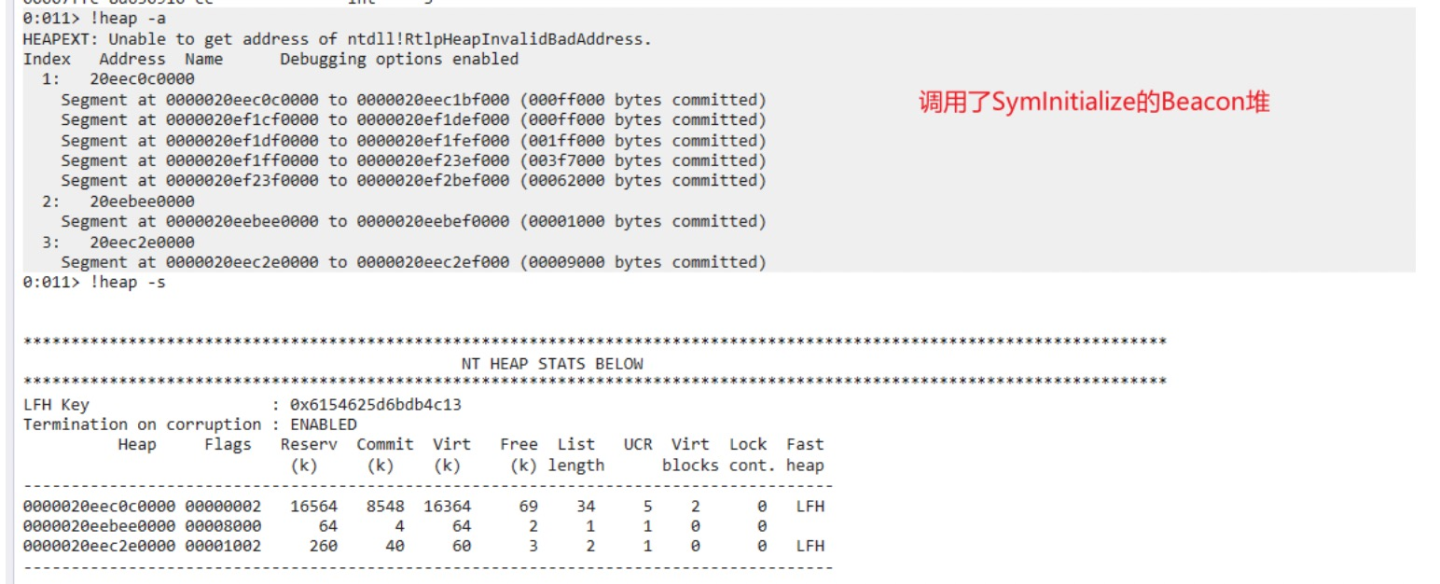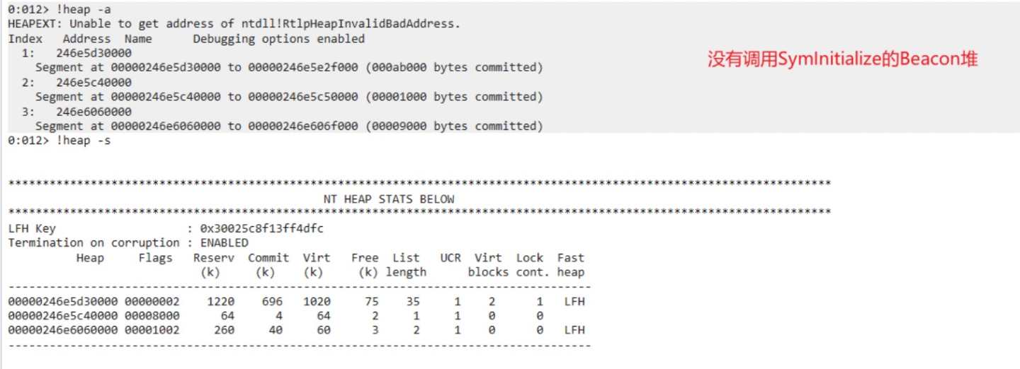 接下来我们分别对调用了SymInitialize和没有调用SymInitialize的Cobalt Strike的Beacon进行windbg调试,由于我们知道BeaconEye扫描的是堆内存,因此我们直接对比两者的堆内存