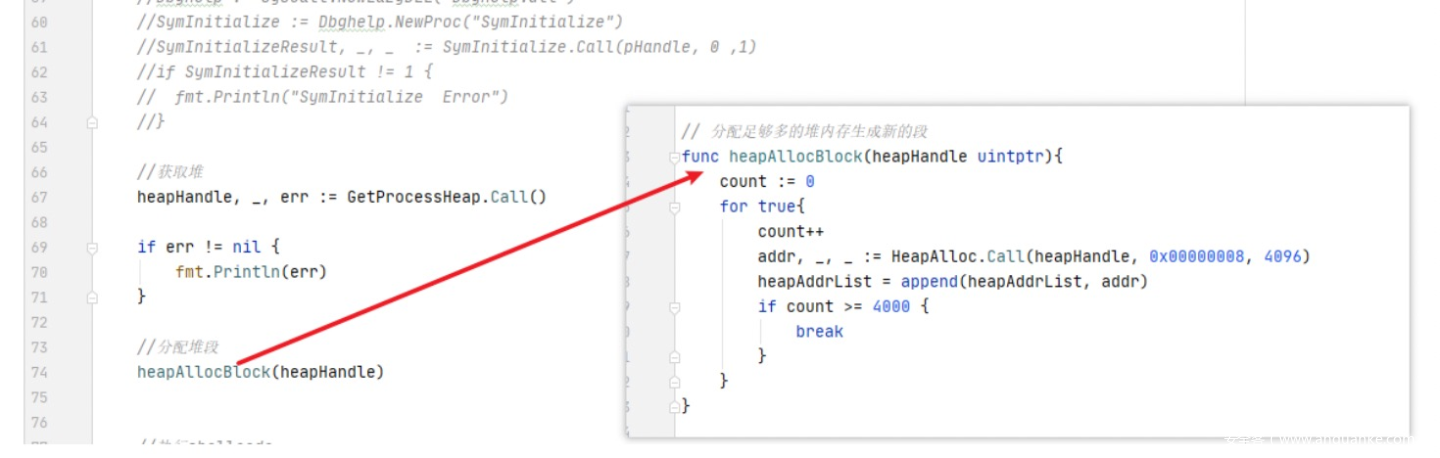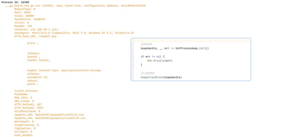 首先我们可以初步得出结论,BeaconEye当中获取堆的信息时,实际只获取了第一个堆段(因为堆段和堆段之间是不连贯的,导致内存页属性不能保持一致),因此假设Beacon Config没有被释放在第一个堆段中,就会导致BeaconEye检测失败,为了实现这个猜想,笔者将SymInitialize注释掉,转而手动调用HeapAlloc进行堆分配(当堆空间分配的足够多时,就会触发系统自动生成堆段),如果这个猜想是正确的,那么BeaconEye将同样无法扫描