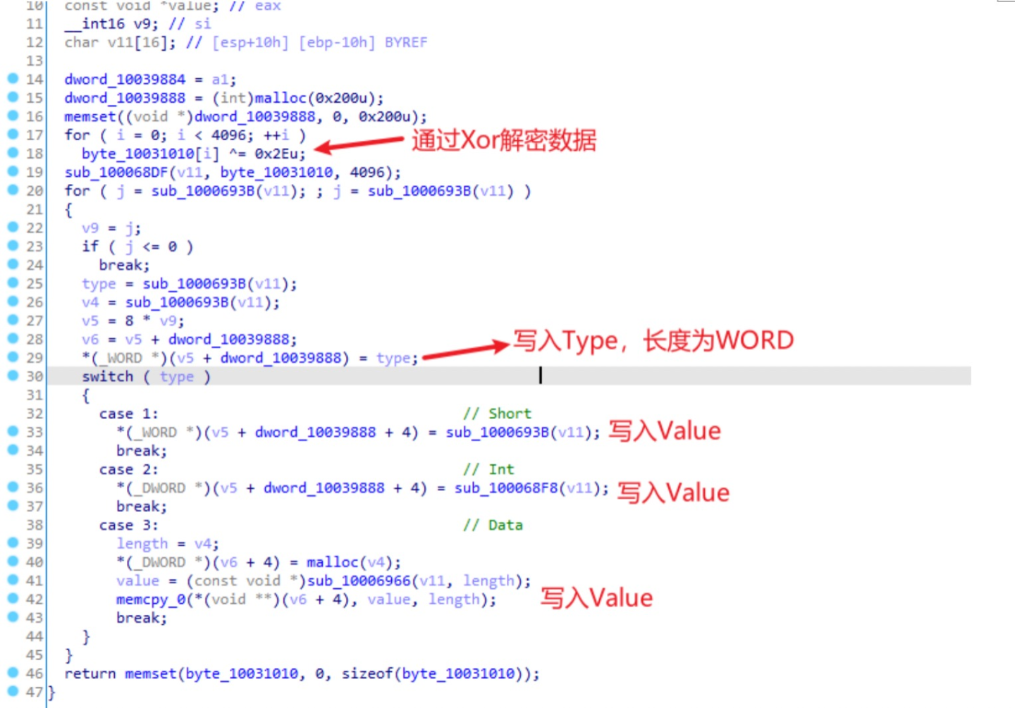 通过dllmain跟进,发现有一个关键函数,里面首先解密了先前Beacon Config的加密数据,然后遍历Beacon Config。首先是在拿到了Type之后,直接往堆中分配的内存写入WORD长度的Type,然后根据Type进行判断,case 1对应Short,case 2对应Int,case 3对应Data,所以实际上最终的Beacon Config的结构是