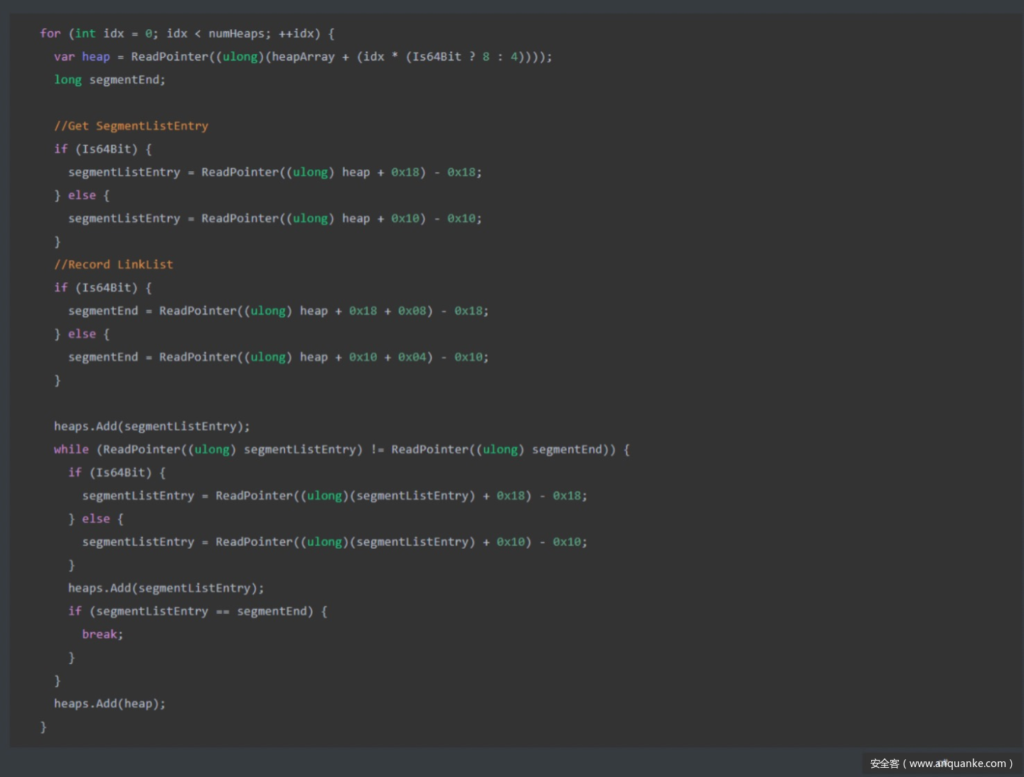 现在不能检测的原因已经找到了,修复其实非常简单,前面提到过,heap结构中包含了堆段的双向链表,因此我们只需要在BeaconEye当中,遍历这个双向链表,将所有堆段地址都添加到待扫描列表中即可,以下是修复代码